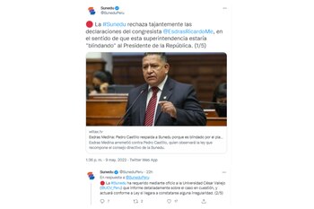 Por su parte, la Sunedu rechazó los dichos del congresista Esdras Medina, presidente de la Comisión de Educación, quien dijo que “Pedro Castillo solo respalda a Sunedu porque es blindado por el plagio de su tesis”.