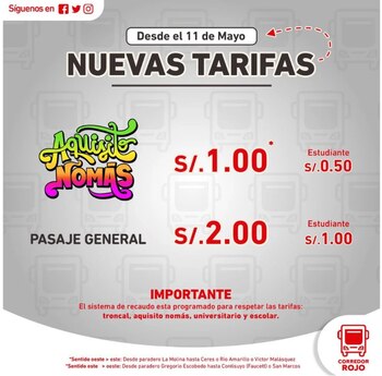 Tal y como anunció Martín Ojeda, vocero de (ACTU), los precios de los corredores Morado, Rojo y Azul se verán incrementados desde este miércoles 11 de mayo. El único que no sufrirá modificación alguna en su tarifa es el Amarillo.