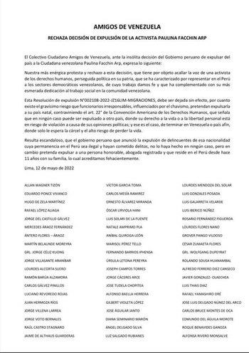 “Nuestra más enérgica protesta y rechazo a esta decisión, que tiene por objeto acallar la voz de una activista de los derechos humanos, perseguida política en su patria, que se ha caracteriza por representar en el Perú a los sectores democráticos venezolanos, de cuyo trabajo damos fe”, se lee en el documento.