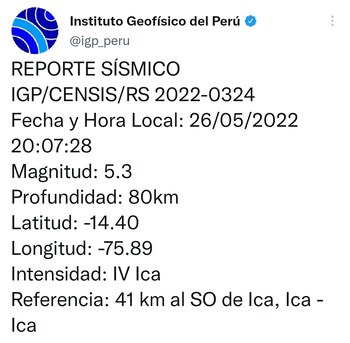 Un sismo de 5.3 grados de magnitud se registró este jueves a las 8:07 p.m., en Ica, al sur del Perú, según el Instituto Geofísico del Perú (IGP), unas horas después del terremoto de 6.9 grados en Puno.