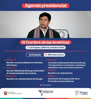 Como parte de su participación en la IX Cumbre de las Américas, el presidente Pedro Castillo se reunió con su homólogo colombiano Iván Duque en el piso dos del hotel donde ambos se alojan por estos días, en Los Ángeles, EE.UU.