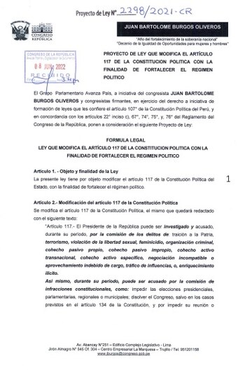 El congresista Juan Burgos (Avanza País) presentó un proyecto de ley para modificar el artículo 117 de la Constitución que está referido a las causales por las que un jefe de Estado puede ser acusado o investigado por el Parlamento. Incluye en su iniciativa que también podría ser juzgado por actos de corrupción cometidos durante su mandato. Esto podría aplicar para el presidente Pedro Castillo, quien viene siendo investigado por la Fiscalía de la Nación.