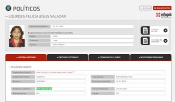 De acuerdo al portal de Infogob, ella pertenece a Perú Libre desde el 30 de setiembre del año pasado. En las últimas elecciones generales, ella postuló con el número 12 por la región Lima al Congreso de la República.