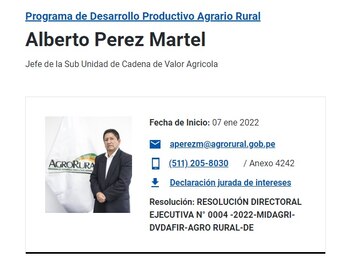 El 7 de enero, Alberto Pérez Martel fue designado jefe de la Sub Unidad de Cadena de Valor Agrícola. Milita en Perú Libre desde el 19 de agosto de 2019. Anteriormente, trabajó como gerente municipal en la Municipalidad Provincial de Huancayo. El 18 de febrero del 2019, el exalcalde Henry López Cantorín, militante también de PL, lo colocó en este puesto de confianza.