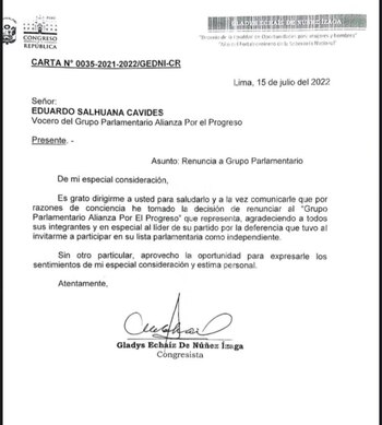 En su misiva, dirigida Eduardo Salhuana, vocero del grupo político, menciona que su dimisión se debe por “razones de conciencia” y agradeció a todos sus integrantes, “en especial” al líder del partido.
