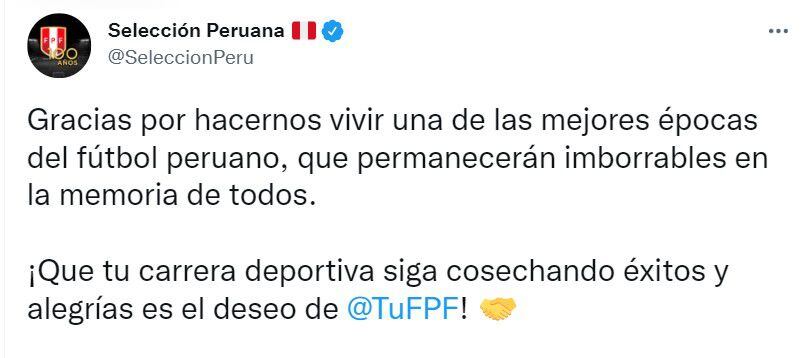 “Gracias por hacernos vivir una de las mejores épocas del fútbol peruano, que permanecerán imborrables en la memoria de todos. ¡Que tu carrera deportiva siga cosechando éxitos y alegrías es el deseo de la FPF!”, citó la Federación a través de su cuenta oficial de Twitter.