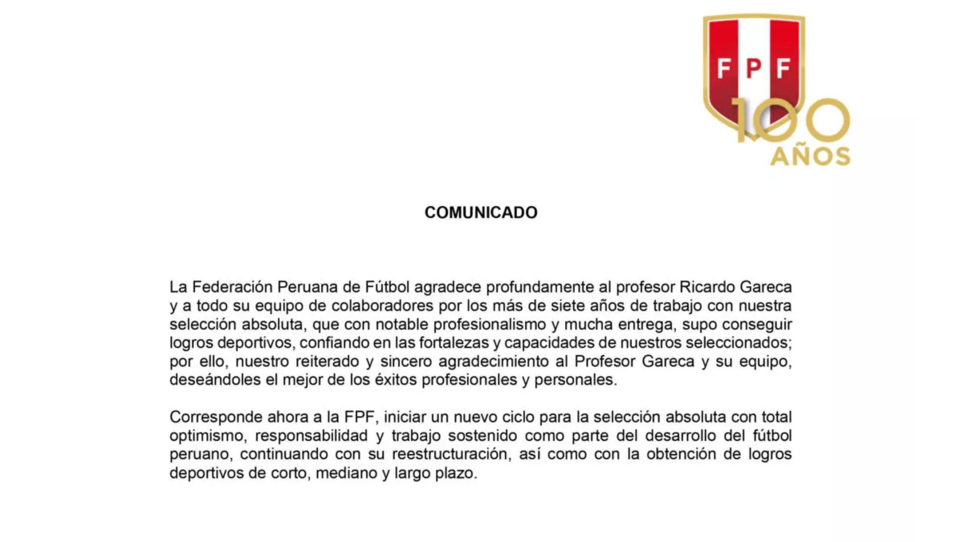 “La Federación Peruana de Fútbol agradece profundamente al profesor Ricardo Gareca y a todo su equipo de colaboradores por los más de siete años de trabajo con nuestra selección absoluta, que con notable profesionalismo y mucha entrega, supo conseguir logros deportivos, confiando en las fortalezas y capacidades de nuestros seleccionados; por ello, nuestro reiterado y sincero agradecimiento al Profesos Gareca y su equipo, deseándoles el mejor de los éxitos profesionales y personales. Corresponde ahora la FPF, inicial un nuevo ciclo para la selección absoluta con total optimismo, responsabilidad y trabajo sostenido como parte del desarrollo del fútbol peruano, continuando con su reestructuración, así como con la obtención de logros deportivos de corto, mediano y largo plazo”, cita el comunicado de la FPF en su portal digital.