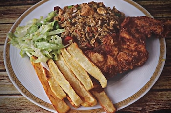 2. Mostrito: El clásico plato limeño que es consumido con mayor frecuencia los fines de semana. Está integrado por pollo a la brasa (o broaster), papas fritas, y arroz chaufa. Por la cantidad, suele salir a partir de 1/8 de pollo.