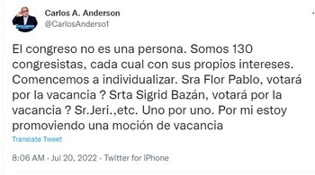 “El congreso no es una persona. Somos 130 congresistas, cada cual con sus propios intereses. Comencemos a individualizar. Sra Flor Pablo, votará por la vacancia? Srta Sigrid Bazán, votará por la vacancia? Sr. Jeri., etc. Uno por uno. Por mi estoy promoviendo una moción de vacancia”, expresó.