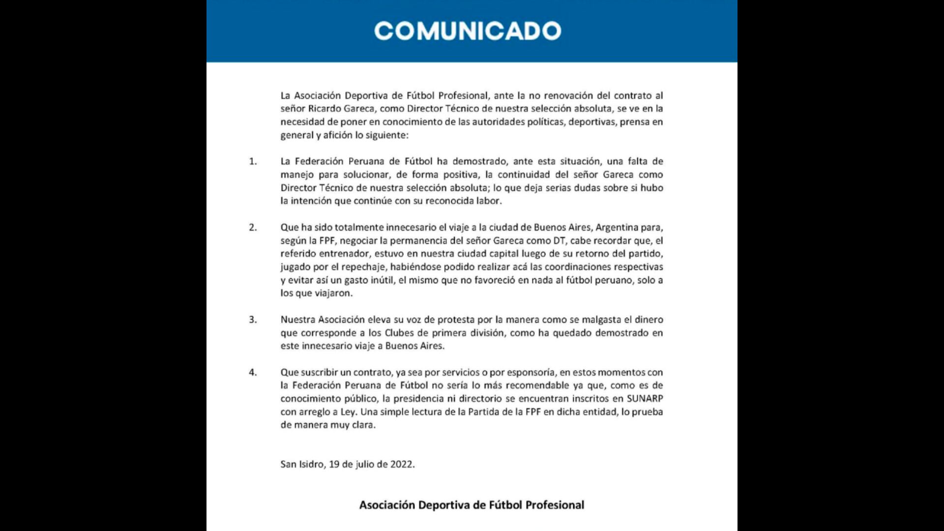 En el primer punto la ADFP señala a la FPF su falta de criterio para manejar la situación y buscar una solución positiva respecto a la continuidad de Gareca como DT de la blanquirroja. Además, expresan que al dar por oficializada la no renovación del ‘Flaco’ generan ciertas dudas sobre si hubo una intención o no de que siga en el cargo.