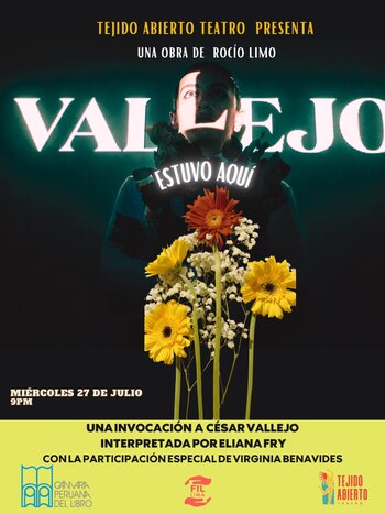 La directora Rocío Limo y la actriz Eliana Fry, con la participacipón especial de la poeta Virginia Benavides, se unen en la obra teatral Vallejo estuvo aquí, una invocación al poeta peruano, bajo la producción de Tejido Abierto, que se presenta este miércoles 27 de julio a las 9:00 p.m. en el Gran Estelar de la Feria Internacional del Libro de Lima (FIL 2022).
