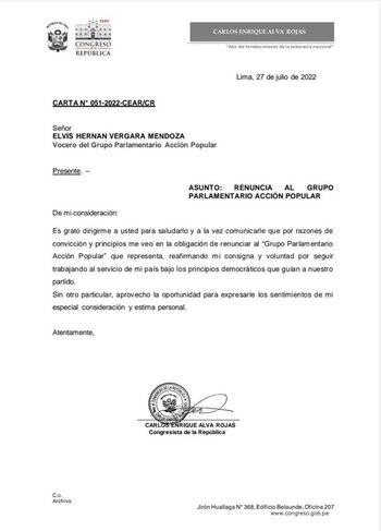 El legislador Carlos Enrique Alva Rojas, congresista por la región de La Libertad, comunicó su salida de la bancada Acción Popular, este último miércoles 27 de julio.