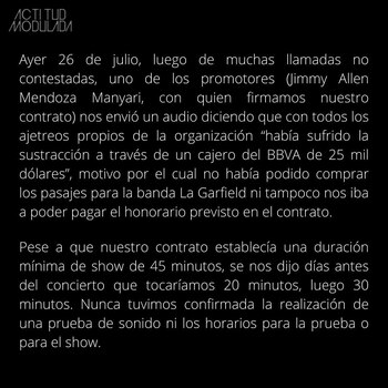 La banda peruana Actitud Modulada denunció que los promotores del evento les indicaron que no les iban a poder pagar el monto acordado en contrato, debido a que fueron víctimas de un robo.