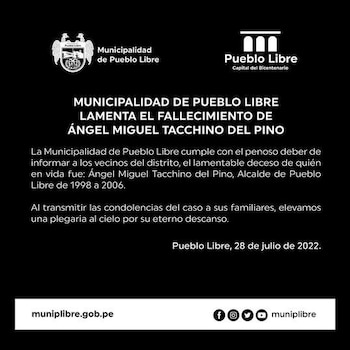 “La Municipalidad de Pueblo Libre lamenta el sensible fallecimiento de quién en vida fue: Ángel Miguel Tacchino del Pino, Alcalde de Pueblo Libre de 1998 a 2006. Elevamos una plegaria al cielo por su eterno descanso”, indicaron en las redes sociales de dicha comuna.
