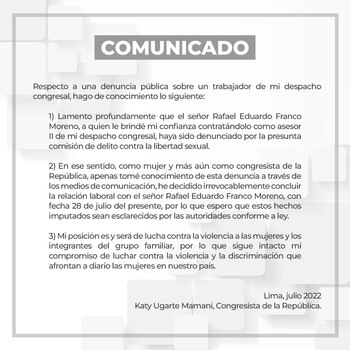 No va más. A través de un comunicado, la congresista del Bloque Magisterial, Katy Ugarte, anunció que su asesor, Rafael Franco Moreno no seguirá trabajando en su despacho, luego de que este sea denunciado por una mujer por haberla violado sexualmente.