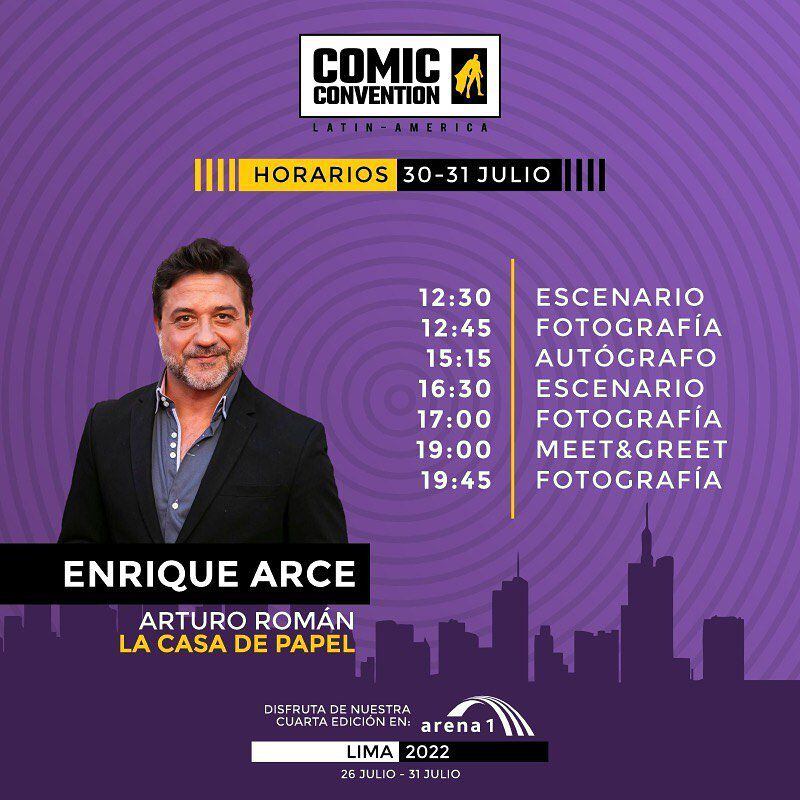 “Hola amigos de Lima, Perú, soy Enrique Arce, aunque seguramente más me conocéis como Arturo Román, de La Casa de Papel. Esto aquí (en la Comic Convention) los días 30 y 31 de julio. Acercarse, hay un montón de actividades, es fantástico y me van a tener muy cerca para firmarles, tomarnos fotos y contarles cosas de la serie, lo que quieran. Un saludo muy grande y aquí los espero”, comentó.