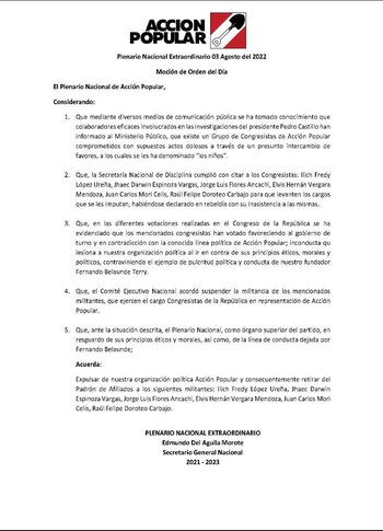 “El Plenario Nacional de Acción Popular acuerda expulsar de nuestra organización política Acción Popular y consecuentemente retirar del Padrón de Afiliados a los siguientes militantes: Ilich Fredy López Ureña, Jhaec Darwin Espinoza Vargas, Jorge Luis Flores Ancachi, Elvis Hernán Vergara Mendoza, Juan Carlos Mori Celis y Raúl Felipe Doroteo Carbajo”, señalan en el documento.