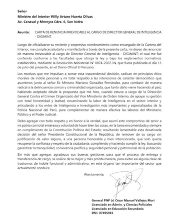 Por su parte, el general en retiro, César Vallejos Mori, presentó su renuncia irrevocable a la Dirección General de Inteligencia (Digimin) de la Policía Nacional. Era el cuarto funcionario colocado en este puesto en lo que va de este gobierno que cumple un año en ocho días.