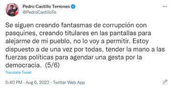 “Esas fuerzas golpistas no tienen el valor y el coraje de pedir la vacancia en una plaza del pueblo, sino que lo hacen desde su curul. Esas fuerzas golpistas que han llegado a una curul con unos miles de votos ante un ciudadano que ha sido elegido con millones de votos del pueblo peruano”, añadió.