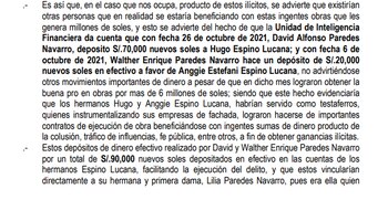 La fiscalía toma en cuenta, además, el reporte de la Unidad de Inteligencia Financiera (UIF) sobre depósitos de los hermanos de la primera dama. El 26 de octubre del año pasado, David Paredes realizó un giro de S/70 mil a la cuenta de Hugo Espino Lucana. El 6 de ese mismo mes, Walther Paredes hizo lo mismo con S/20 mil. Los depósitos se hicieron con dinero en efectivo.
