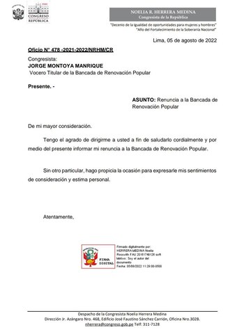 Este último viernes 5 de agosto, la congresista Noelia Herrera Medina renunció a la bancada de Renovación Popular tras remitirle mediante un comunicado su decisión al vocero de la bancada Jorge Montoya.