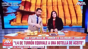 La imagen, que copó algunas cuentas de Twitter este jueves, mostraba una mesa con panes, azúcar, chocolates y otros productos asociados a un combo de calorías. Al fondo, el conductor de ATV Noticias sostenía un plato con una porción de turrón (un cuarto de kilo), el dulce tradicional peruano. A un lado, la nutricionista Claudia Agüero explicaba algunas equivalencias.