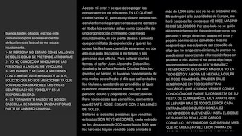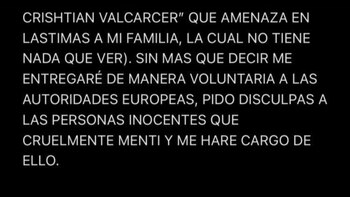 “Lamento que por mi falta de experiencia y querer las cosas fáciles haya cometido este error. Es por ello que pido disculpas a mi familia y las personas que afecté”, escribió, agregando que sus padres desconocían lo que estaba haciendo y se enteraron cuando salió en los medios de comunicación, “quedando sorprendidos al igual que cada miembro de mi familia, soy una persona adulta y pagaré las consecuencias”.