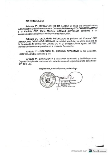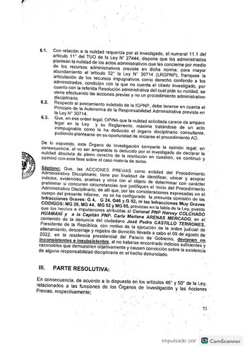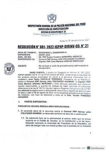 Esto se confirmó con las conclusión a la que llegaron en la Inspectoría General. “Los hechos e imputaciones atribuidas al coronel PNP Harvey Colchado (...), en el contenido de la denuncia del ciudadano José Pedro Castillo Terrones, presidente de la República, con motivo de la ejecución de la orden judicial de allanamiento, descerraje y registro de domicilio llevada a cabo el 09 de agosto de 2022, en la residencia presidencial del Palacio de Gobierno, devienen en inconsistentes e insubsistentes, al no haberse encontrado indicios suficientes y razonables que demuestren objetivamente y causen convicción sobre la existencia de alguna responsabilidad disciplinaria en el hecho denunciado”, se lee en el documento al que Infobae accedió.