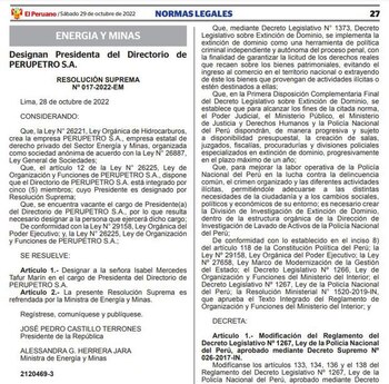 En el diario oficial El Peruano se lee lo siguiente: “Designar a la señora Isabel Mercedes Tafur Marín en el cargo de Presidenta del Directorio de PERUPETRO S.A.”