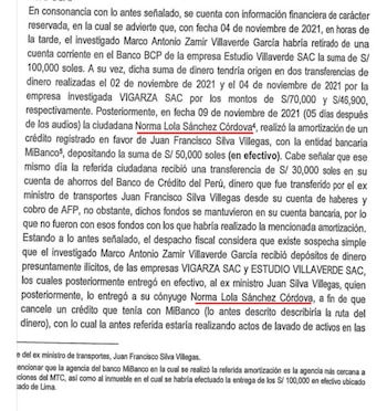 En la resolución fiscal se señala que la Fiscalía cuenta con información financiera sobre un retiro de S/ 100 mil por parte de Villaverde. El origen de este dinero provendría de dos transferencias hechas por Vigarza, una de S/70 mil y otra de S/ 46,900.