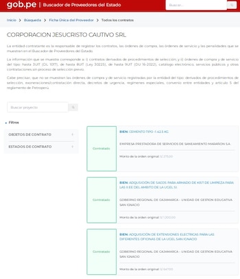 Luego, Corporación Jesucristo Cautivo SRL suscribió nueve contratos por S/ 11 553 con la Empresa Prestadora de Servicios de Saneamiento Marañón (EPS Marañón S.A.) que está bajo la administración del Organismo Técnico de la Administración de los Servicios de Saneamiento (OTASS). Esta entidad está adscrita al Ministerio de Vivienda, Construcción y Saneamiento.