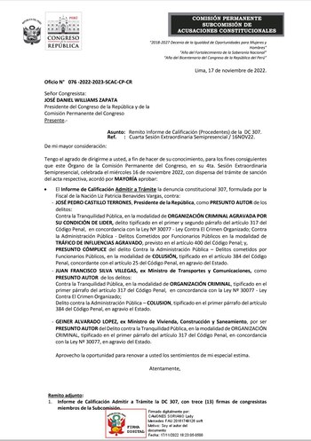 La Subcomisión de Acusaciones Constitucionales (SAC), presidida por la congresista Lady Camones (Alianza Para el Progreso), envió un oficio al titular del Parlamento, José Williams Zapata (Avanza País), para informar sobre la aprobación de dicha acusación.