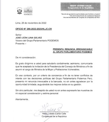 En un oficio enviado a José Luna, vocero del grupo parlamentario, Juárez comunicó su “renuncia irrenunciable” tras aceptar la invitación de la Presidencia del Consejo de Ministros, un gesto calificado por la oposición como una traición y un mecanismo para ascender en el poder.