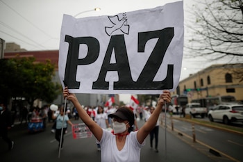 Un grupo de organizaciones civiles, policías en retiro y familiares de efectivos en actividad realizan este viernes una ‘marcha por la paz’ en medio de la represión en protestas contra el gobierno de la presidenta Dina Boluarte y el Congreso.