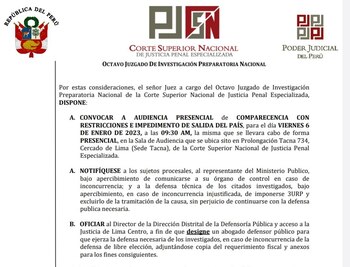 Según el documento del Poder Judicial, todas las partes procesales, así como sus abogados defensores, ya fueron citados a dicha audiencia. Además, fue convocado el representante del Ministerio Público.
