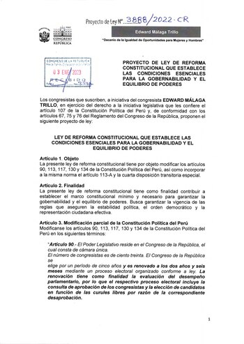 La propuesta se presenta en el marco de la salida del expresidente Pedro Castillo del cargo. El máximo representante del Ejecutivo vulneró el orden constitucional, el pasado miércoles siete de diciembre, al dar un autogolpe de Estado que no fue secundado por las Fuerzas Armadas (FF.AA.) y la Policía Nacional del Perú (PNP).