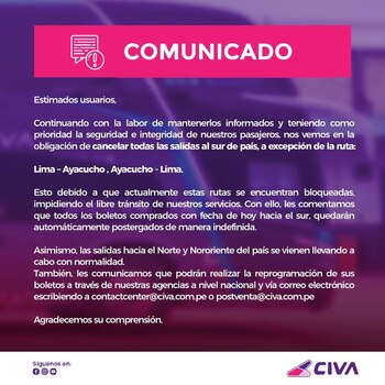 CIVA ha cancelado todas sus salidas hacia el sur del Perú, teniendo como única excepción la ruta de Lima-Ayacucho y Ayacucho-Lima. En el caso de los tramos hacia el norte y nororiente del Perú, estos se vienen llevando con normalidad. Detallaron que los boletos comprados quedarán postergados de manera indefinida y se podrá hacer la reprogramación de los viajes.