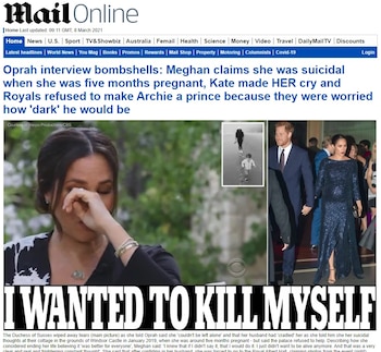 El sitio web del tabloide también incluía un banner destacado que decía: “QUISE MATARME” (que no es una textual de Meghan), y presentaba un clip que se reproducía en bucle de la entrevista, que mostraba a Meghan diciendo, con subtítulos de la frase que sí dijo: “Simplemente no quería seguir viva”.