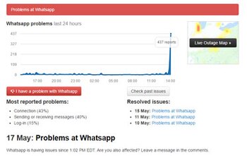 Una vez más la popular aplicación de mensajería WhatsApp experimenta problemas en todo el mundo. De acuerdo a los reportes de sitios especializados, el servicio está caído en países de los cinco continentes. La falla es similar a la registrada el 3 de mayo, cuando la app estuvo sin funcionar durante más de dos horas a nivel mundial.