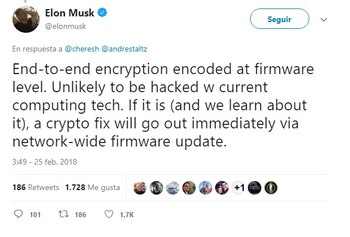 Musk también dijo que la red contará con cifrado punto a punto a nivel del firmware, que sería muy difícil de vulnerar. Y que en caso de que hubiese un intento de hackeo, se enviaría una actualización inmediata a toda la red.