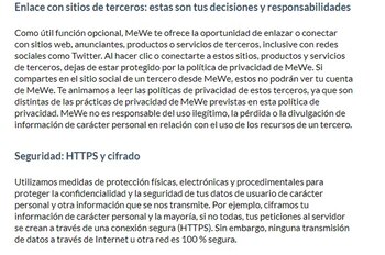 Se aclara que MeWe ofrece la opción de vincular la plataforma con otros servicios o sitios de terceros (por ejemplo para compartir información a través de ellos) pero al hacerlo, el usuario deja de estar protegido por la política de privacidad de MeWe. En este punto tampoco se diferencia de lo que ocurre en otras plataformas.