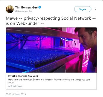 Esta red social, que fue desarrollada por Mark Weinstein, cuenta con el visto bueno del padre de internet, Tim Berners-Lee. Al menos así lo dejó en claro desde su cuenta de Twitter cuando, en 2015, invitó a los usuarios a apoyar esta startup.