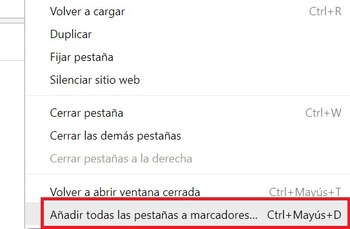 Si se abrieron varias páginas para, por ejemplo, leer varios artículos sobre un tema, Chrome permite guardar esa selección de pestañas todas juntas para que no se pierda esa investigación. Para eso hay que hacer clic con el botón derecho sobre una de las pestañas y elegir la opción "Agregar todas las pestañas a marcadores".