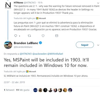 La próxima versión de Windows 10, conocida como "Actualización de Mayo 2019 (1903)", seguirá contando con este programa. "Sí, Paint estará en 1903. [La aplicación] continuará en Windows 10 por ahora", confirmó en Twitter Brandon LeBlanc, parte del equipo de programa de Windows Insider en Microsoft.