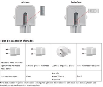 La seguridad del cliente es siempre la principal prioridad de Apple, y hemos decidido voluntariamente cambiar los adaptadores de enchufe de pared afectados por un nuevo adaptador, sin cargo. Animamos a los clientes a cambiar su adaptador de enchufe de pared mediante el proceso que se describe a continuación.