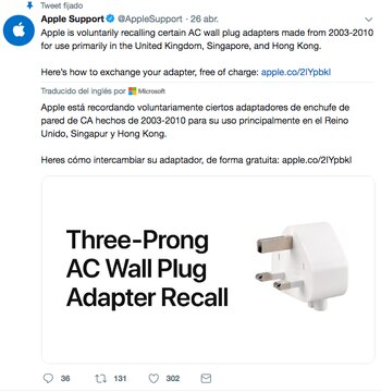 La marca informó: Apple ha determinado que, en casos muy raros, los adaptadores de enchufe de pared de CA de tres patas de Apple diseñados principalmente para su uso en el Reino Unido, Singapur y Hong Kong pueden romperse y crear un riesgo de descarga eléctrica si se tocan las partes metálicas expuestas. Este adaptador de enchufe de pared se envió de 2003 a 2010 con Mac y ciertos dispositivos iOS, y también se incluyó en el Kit de adaptadores para viajes mundiales de Apple.