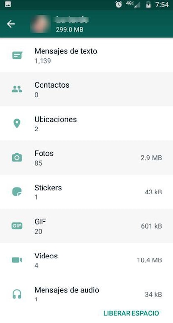 Al dar clic sobre el nombre del contacto, WhatsApp muestra la cantidad de mensajes de texto, contactos, ubicaciones, fotos y stickers han sido compartidos entre ambos usuarios, aunque también muestra a grupos donde se esté incluido.