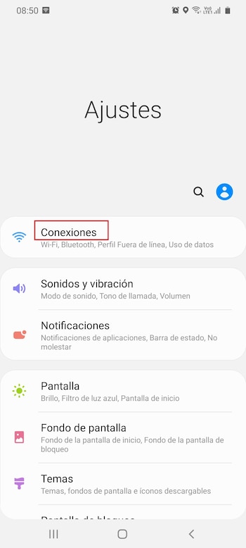 En el celular desde donde vas a compartir la conexión, presioná en Ajustes (el ícono de la tuerca), y se va a desplegar el menú de opciones. Allí elegí donde dice Conexiones.