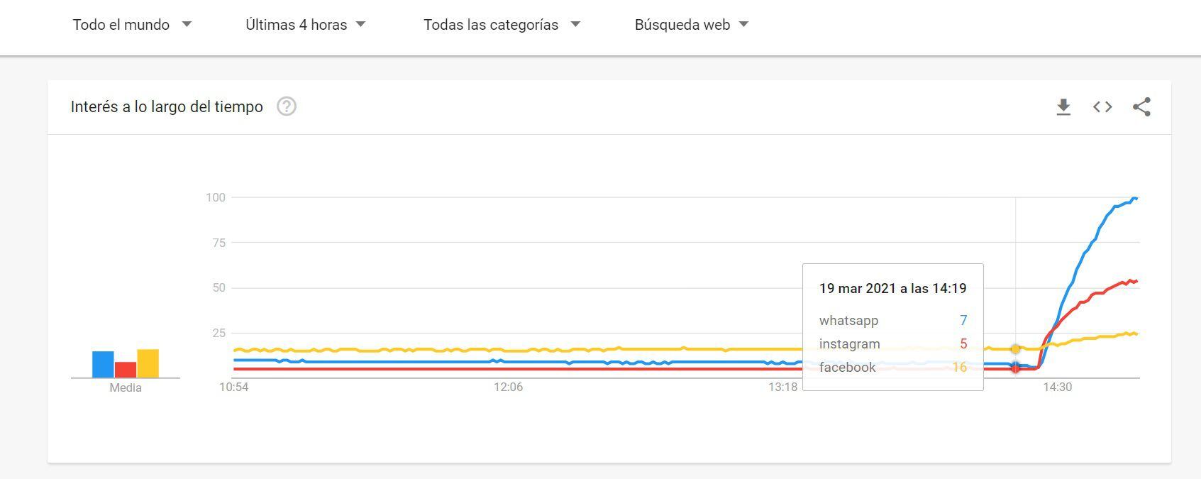 Además, se registró un notable incremento de búsquedas en la web en relación a estas tres aplicaciones, según datos de Google Trends. Como se puede ver en el gráfico los usuarios estuvieron buscando información sobre esta caída en todo el mundo.