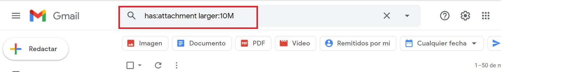 Dentro de Gmail ingresa en el cuadro de búsqueda (junto al ícono de la lupa) y escribe has:attachment larger:10M. Eso filtrará los correos con adjuntos mayores a 10M. Puedes reemplazar el 10 por un número mayor si quieres eliminar archivos más pesados.